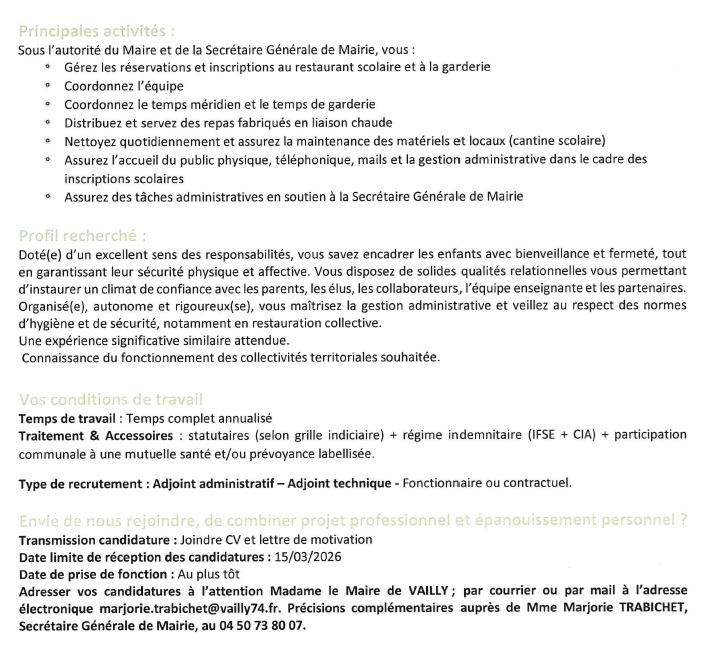 La commune de Vailly recrute son / sa responsable du service périscolaire La mairie de Vailly recrute